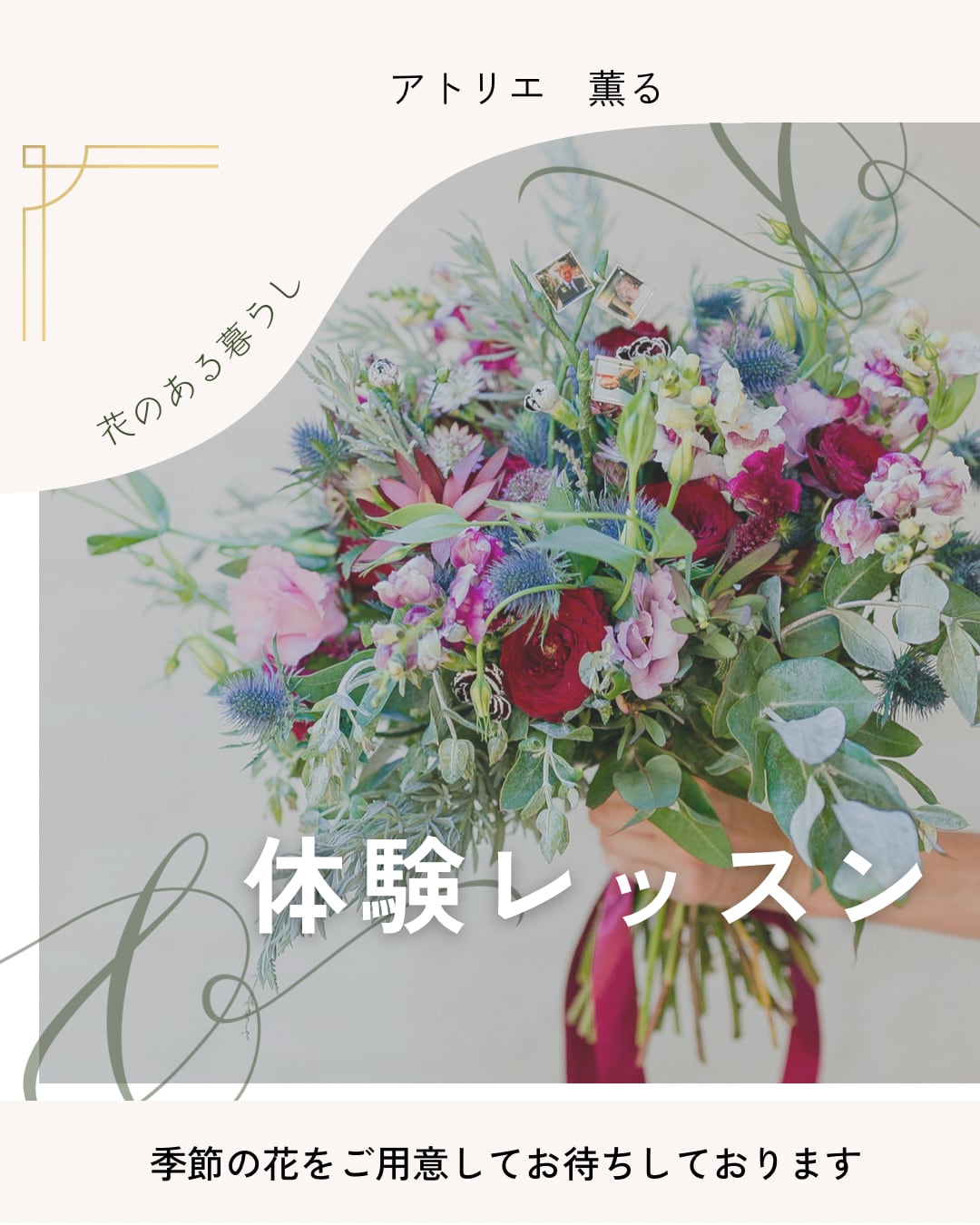 時期に出回っているお花を使ってアレンジメントを作っていただく、体験レッスンとなっています。